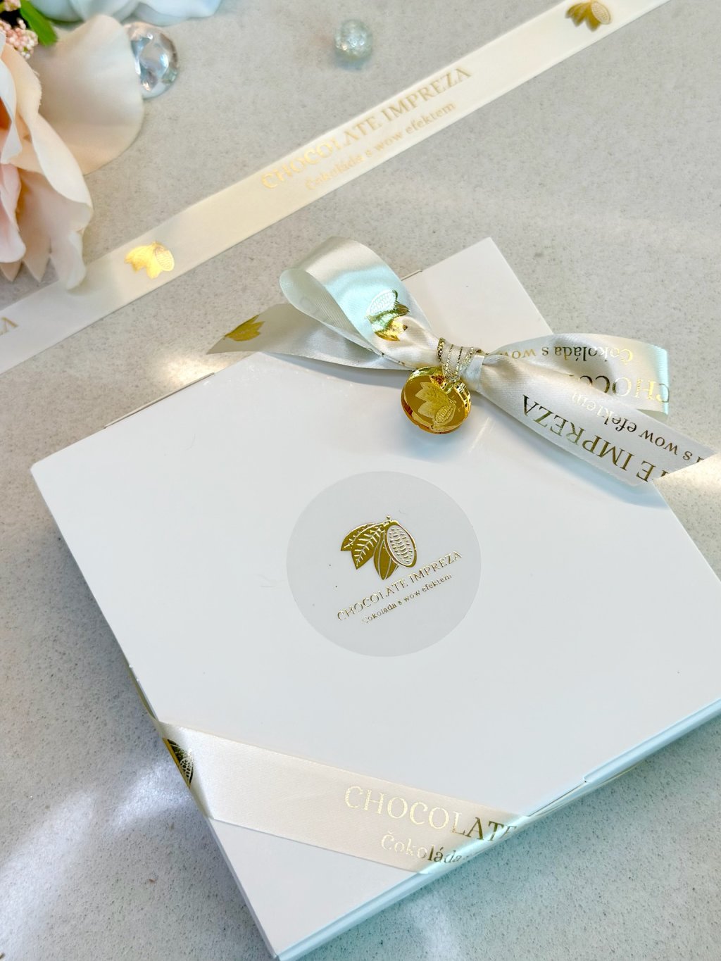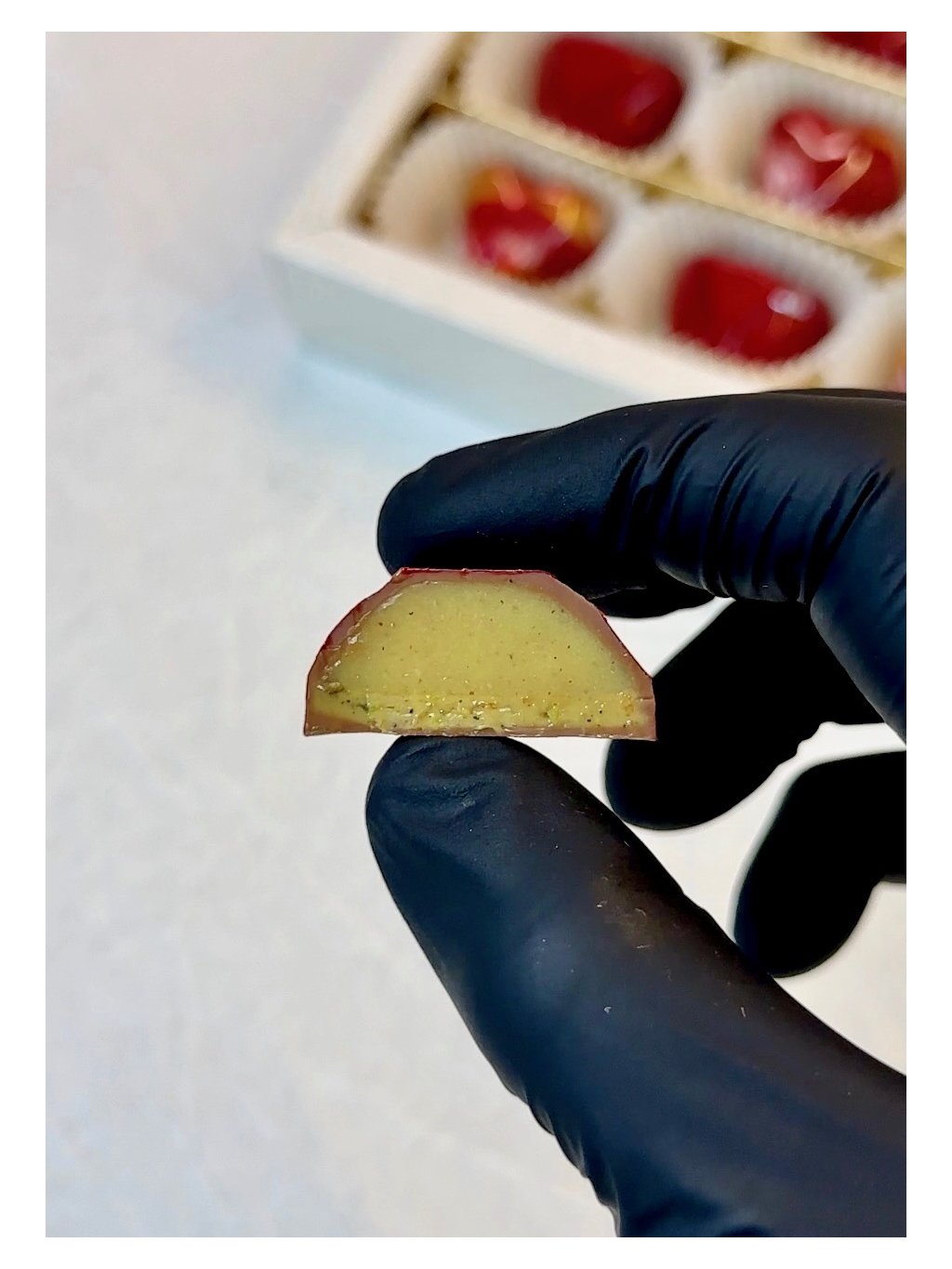 Mléčná čokoláda Callebaut 33,6%, bílá čokoláda Callebaut Velvet, karamelizovaná čokoláda Callebaut Gold (kakaové máslo, sušené plnotučné mléko, kakaová hmota, cukr,karamelizovaný cukr 2%, emulgátor: sójový lecithin, přírodní vanilkové aroma),karamelizovaný popcorn, kešu máslo, pistáciová pasta, drcené pistácie, drcený bisquit Paillete feuilletine, smetana, kakaové máslo, jahodové pyré, pektin, kyselina citronová, máslo ghí, máslo, cukry (glukózový sirup, dextróza, sorbitol), sůl, barevné kakaové máslo.